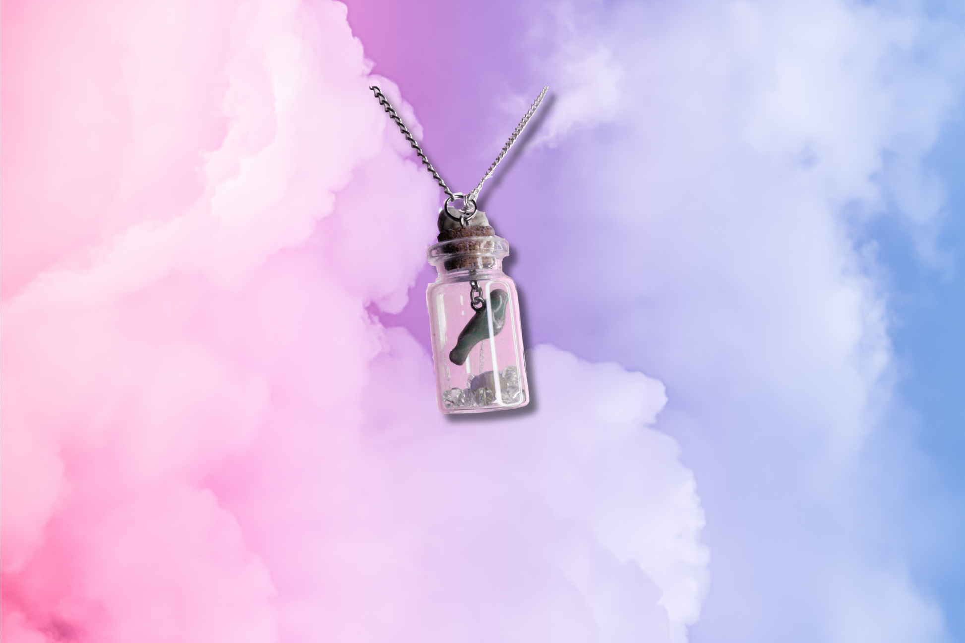 Howlite Bone, Green Bird, Clear Crystals, Pearls, Skulls in Glass Bottle on Chain Necklace